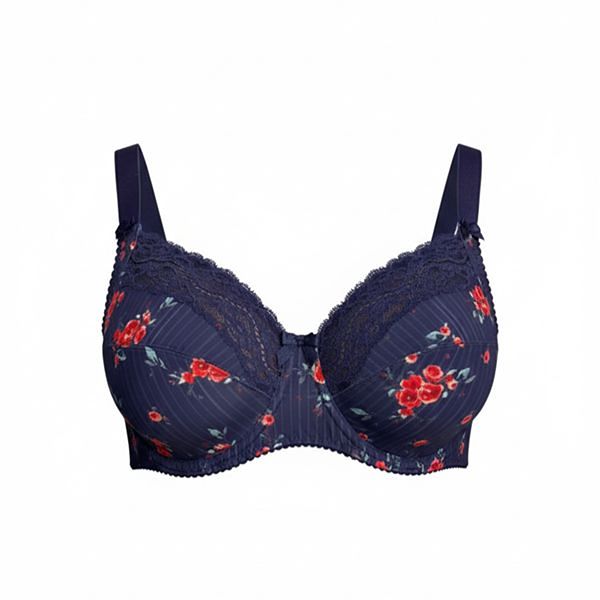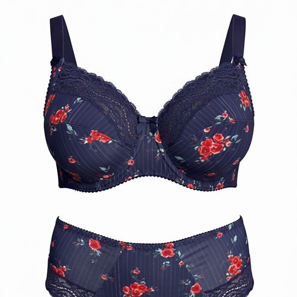 Soutien-gorge souple à armature tout en maille imprimée. Incrustation de dentelle barbe au décolleté. Le bas de basque est enrichi d’une bordure fantaisie. Noeud à l’entrebonnet. Bretelles en continue élastique avec une fantaisie en maille imprimée sur le départ devant.